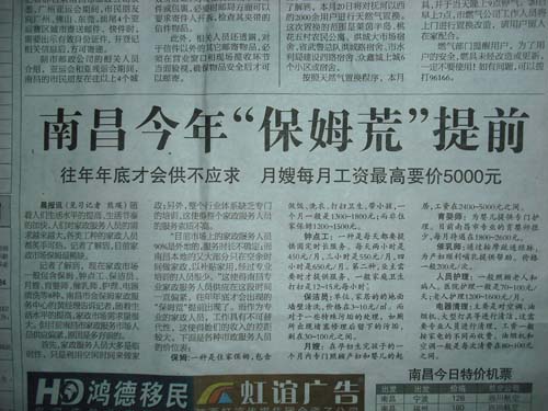 記者了解到,現(xiàn)在家政市場一般包含保姆、鐘點工、保潔員、月嫂、育嬰師、催乳師、護(hù)理、電器清洗等8種。南昌市金保姆家政服務(wù)中心的黃經(jīng)理告訴記者,隨著生活水平的提高,家政市場需求量很大。但目前南昌市家政服務(wù)市場人員供應(yīng)偏緊,原因是多方面的。